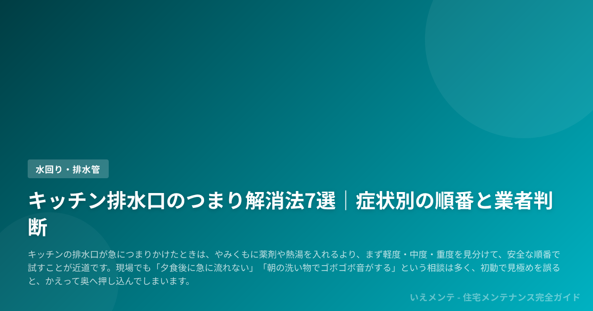 キッチンの排水口が急につまりかけたときは、やみくもに薬剤や熱湯を入れるより、まず軽度・中度・重度を見分けて、安全な順番で試すことが近道です。