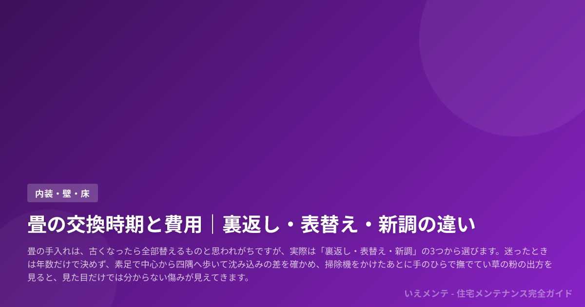 年数の目安を先に並べると、裏返しは新調後約3〜5年、表替えは約4〜8年、または裏返し後約5年、新調は約10〜15年がひとつの基準です。