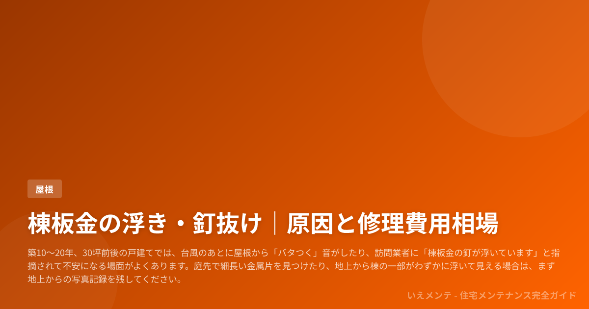 築10〜20年、30坪前後の戸建てでは、台風のあとに屋根から「バタつく」音がしたり、訪問業者に「棟板金の釘が浮いています」と指摘されて不安になる場面がよくあります。