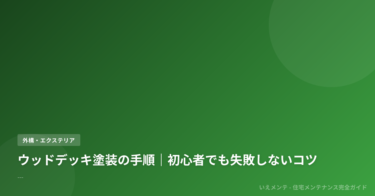 Эта статья на 日本語. Версия на Русский готовится.Главная>Участок и экстерьер>ウッドデッキのメンテナンス方法|塗装・防腐・修理>ウッドデッキ塗装の手順|初心者でも失敗しないコツУчасток и экстерьерウッドデッキ塗装の手順|初心者でも失敗しないコツ2026-03-19Обновлено: 2026-03-19 22:52:00田中 美咲Поделиться статьёй田田中 美咲リフォーム会社で8年間の施工管理経験後、DIYアドバイザーとして独立。壁紙の張り替えからウッドデッキの塗装まで、「失敗してもリカバリーできる方法」を丁寧にお届けします。