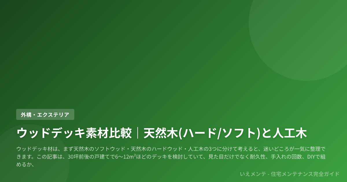 この記事は、30坪前後の戸建てで6〜12m²ほどのデッキを検討していて、見た目だけでなく耐久性、手入れの回数、DIYで組めるか、税込の初期費用と長く使ったときの負担まで一度に見比べたい人に向けて書いています。