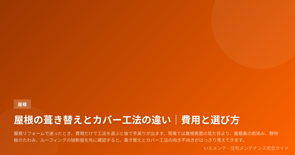 現場では屋根表面の見た目より、屋根裏の雨染み、野地板のたわみ、ルーフィングの破断痕を先に確認すると、葺き替えとカバー工法の向き不向きがはっきり見えてきます。